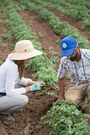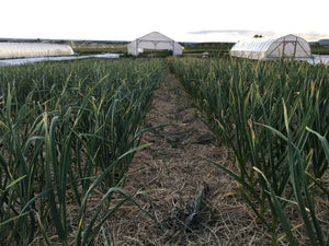 In an age of drought and increasing climate instability, how can we adapt? How can vegetable growers be better prepared for years like this? What crops make sense for the future? Amongst our four farms, one plant stood out as particularly resilient, and that was GARLIC! Garlic harvests were bountiful across the board. It seemed that this pungent, powerful Allium was exceptionally undesirable to the hoppers. Beyond that, its timely July harvest window makes garlic a reliable crop to produce, even in the tightest of water years. Garlic thrives at our high elevation and appreciates the cool nights and desert air. On the consumer and market end, it is a keystone of the culinary world, and an essential item in many growers seed stock.